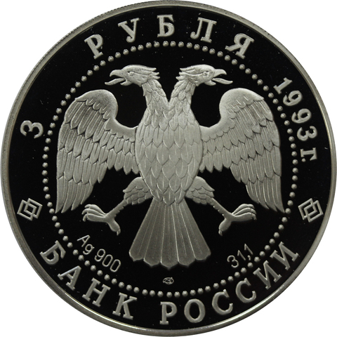 Аверс: Вверху вдоль канта номинал «3 рубля» и год выпуска «1993 г.», внизу слова «БАНК РОССИИ». В середине в ободке из точек двуглавый орел под ним с внутренней стороны точечного ободка слева химическое название «Ag» и проба «900» металла, далее направо монограмма монетного двора «ЛМД» и чистый вес находящегося в монете драгоценного металла «31,10».