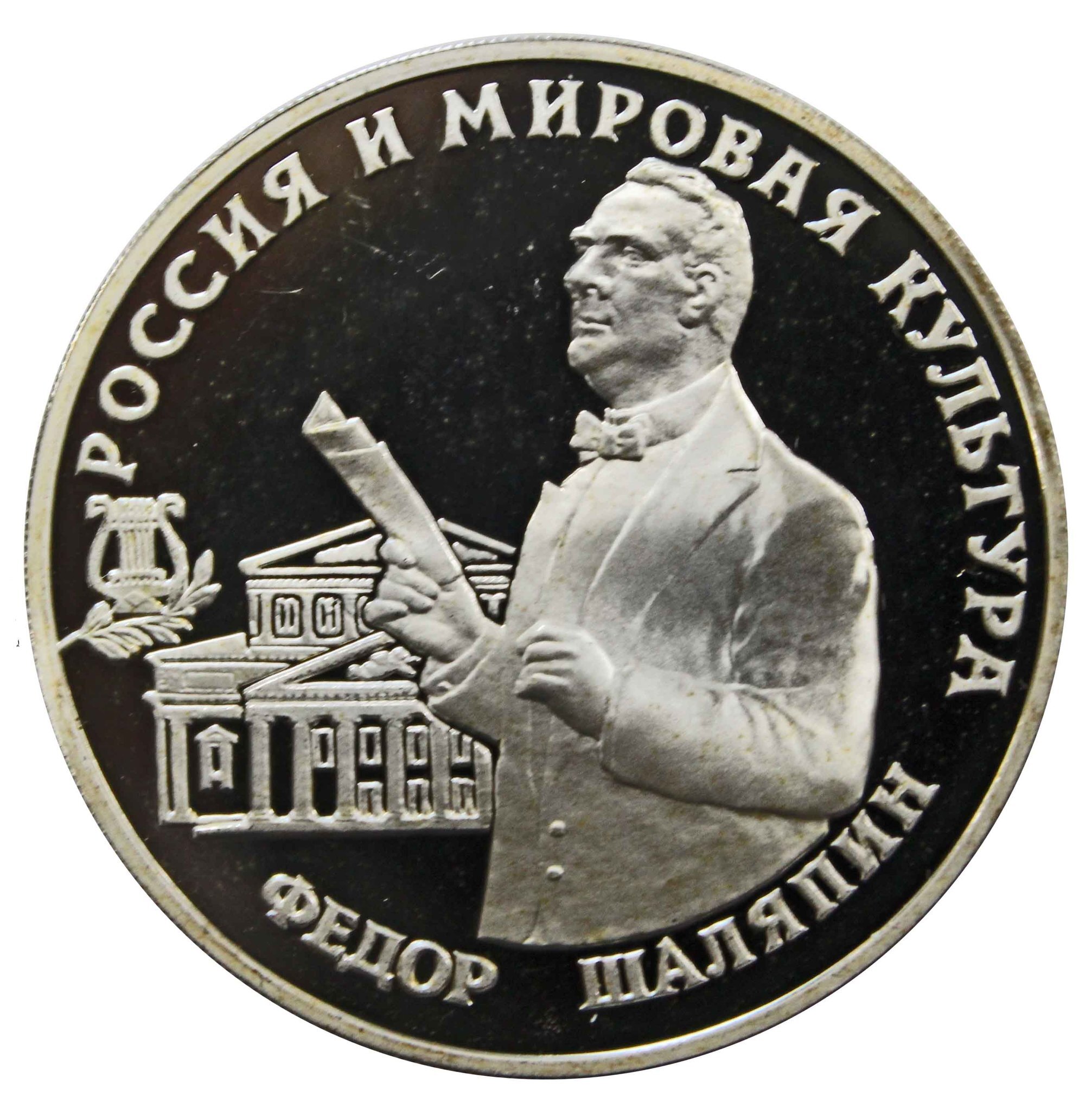 Реверс: Изображение Фёдора Шаляпина на фоне Большого театра в Москве, слева от изображения - лира и лавровая ветвь, по окружности надписи: вверху - "РОССИЯ И МИРОВАЯ КУЛЬТУРА", внизу - "ФЁДОР ШАЛЯПИН".