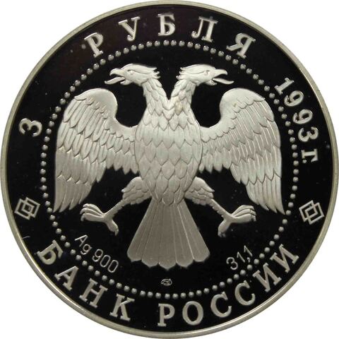 Аверс: вверху вдоль канта обозначение достоинства монеты «ТРИ РУБЛЯ», слева и справа под номиналом орнамент, внизу слова «БАНК РОССИИ». В середине двуглавый орел.