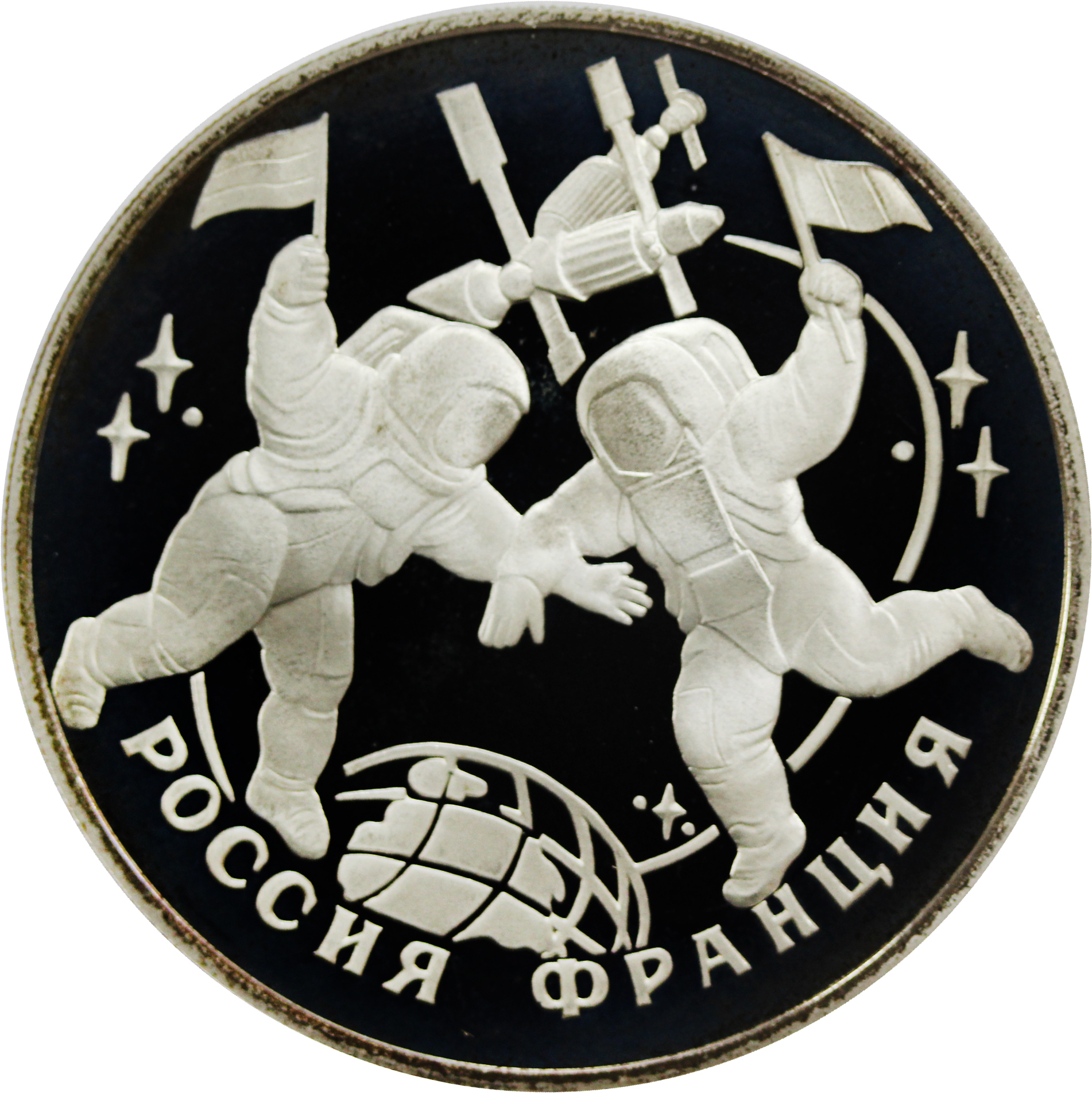 Реверс: В центре - изображения двух космонавтов в скафандрах с российским и французским флагами в руках на фоне орбитальной космической станции, звёзд и стилизованного изображения Земли, внизу по окружности - надпись: "РОССИЯ ФРАНЦИЯ".