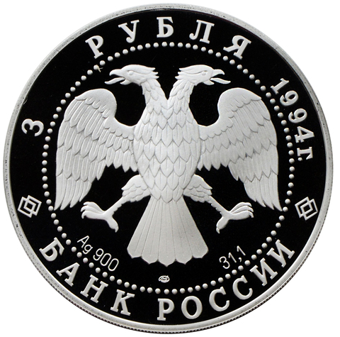 Аверс: Вверху вдоль канта номинал «3 рубля» и год выпуска «1994 г.», внизу слова «БАНК РОССИИ». В середине в ободке из точек двуглавый орел под ним с внутренней стороны точечного ободка слева химическое название «Ag» и проба «900» металла, далее направо монограмма монетного двора «ЛМД» и чистый вес находящегося в монете драгоценного металла «31,10».