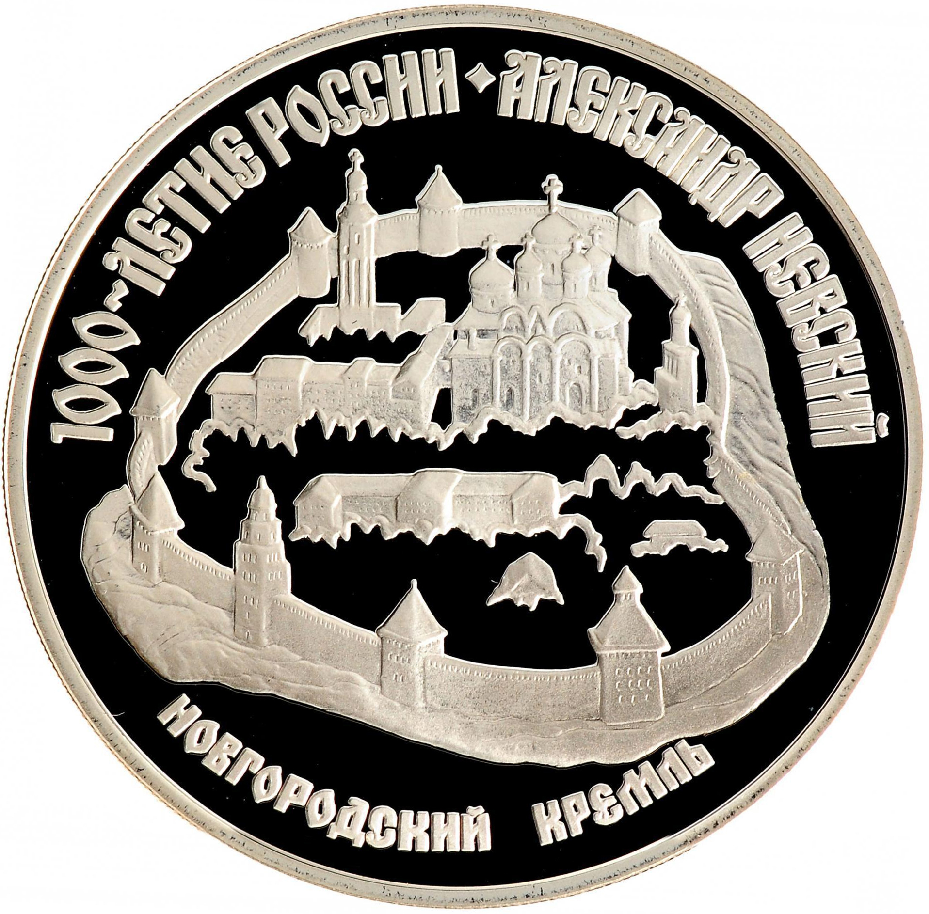 Реверс: Изображение панорамы Новгородского Кремля, по окружности - надписи: вверху - "1000-ЛЕТИЕ РОССИИ * АЛЕКСАНДР НЕВСКИЙ", внизу - "НОВГОРОДСКИЙ КРЕМЛЬ".