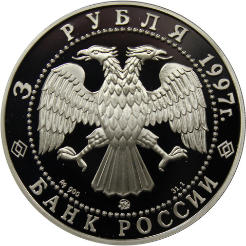Аверс: Вверху вдоль канта номинал «3 рубля» и год выпуска «1997 г.», внизу слова «БАНК РОССИИ». В середине в ободке из точек двуглавый орел под ним с внутренней стороны точечного ободка слева химическое название «Ag» и проба «900» металла, далее направо монограмма монетного двора «ММД» и чистый вес находящегося в монете драгоценного металла «31,10».