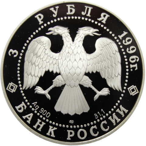 Аверс: Вверху вдоль канта номинал «3 рубля» и год выпуска «1996 г.», внизу слова «БАНК РОССИИ». В середине в ободке из точек двуглавый орел под ним с внутренней стороны точечного ободка слева химическое название «Ag» и проба «900» металла, далее направо монограмма монетного двора «ЛМД» и чистый вес находящегося в монете драгоценного металла «31,10».