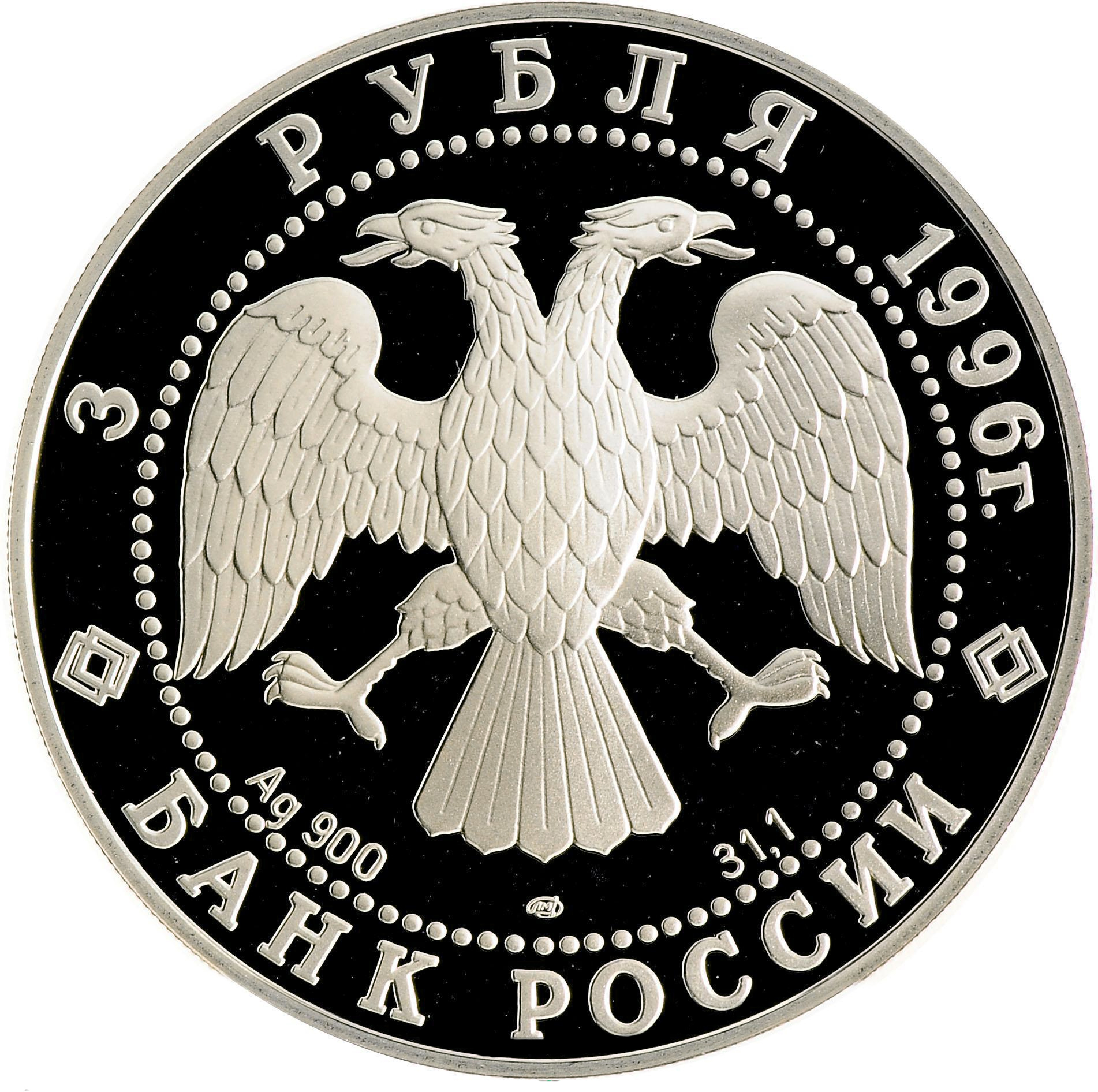 Аверс: Вверху вдоль канта номинал «3 рубля» и год выпуска «1996 г.», внизу слова «БАНК РОССИИ». В середине в ободке из точек двуглавый орел под ним с внутренней стороны точечного ободка слева химическое название «Ag» и проба «900» металла, далее направо монограмма монетного двора «ЛМД» и чистый вес находящегося в монете драгоценного металла «31,10».