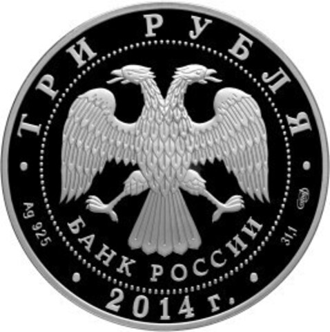 Аверс: вверху вдоль канта номинал «ТРИ РУБЛЯ», внизу слева химическое название «Ag» и проба «925» металла, внизу по центру год выпуска «2014 г.», внизу справа чистый вес находящегося в монете драгоценного металла «31,10» и монограмма монетного двора «СПМД». В середине в ободке из точек двуглавый орел под ним с внутренней стороны точечного ободка слова «БАНК РОССИИ».
