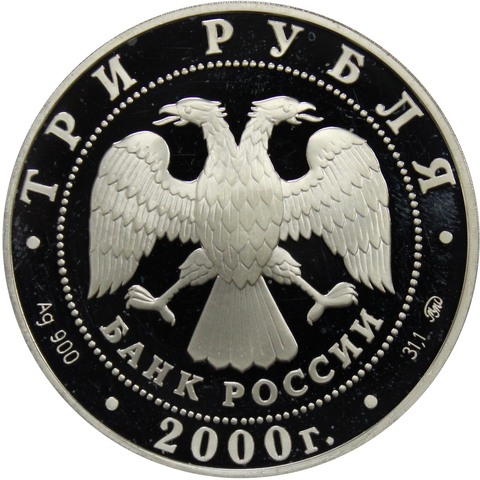 Аверс: Вверху вдоль канта номинал «ТРИ РУБЛЯ», внизу слева химическое название «Ag» и проба «900» металла, внизу по центру год выпуска «2000 г.», внизу справа чистый вес находящегося в монете драгоценного металла «31,10» и монограмма монетного двора «ММД». В середине в ободке из точек двуглавый орел под ним с внутренней стороны точечного ободка слова «БАНК РОССИИ».