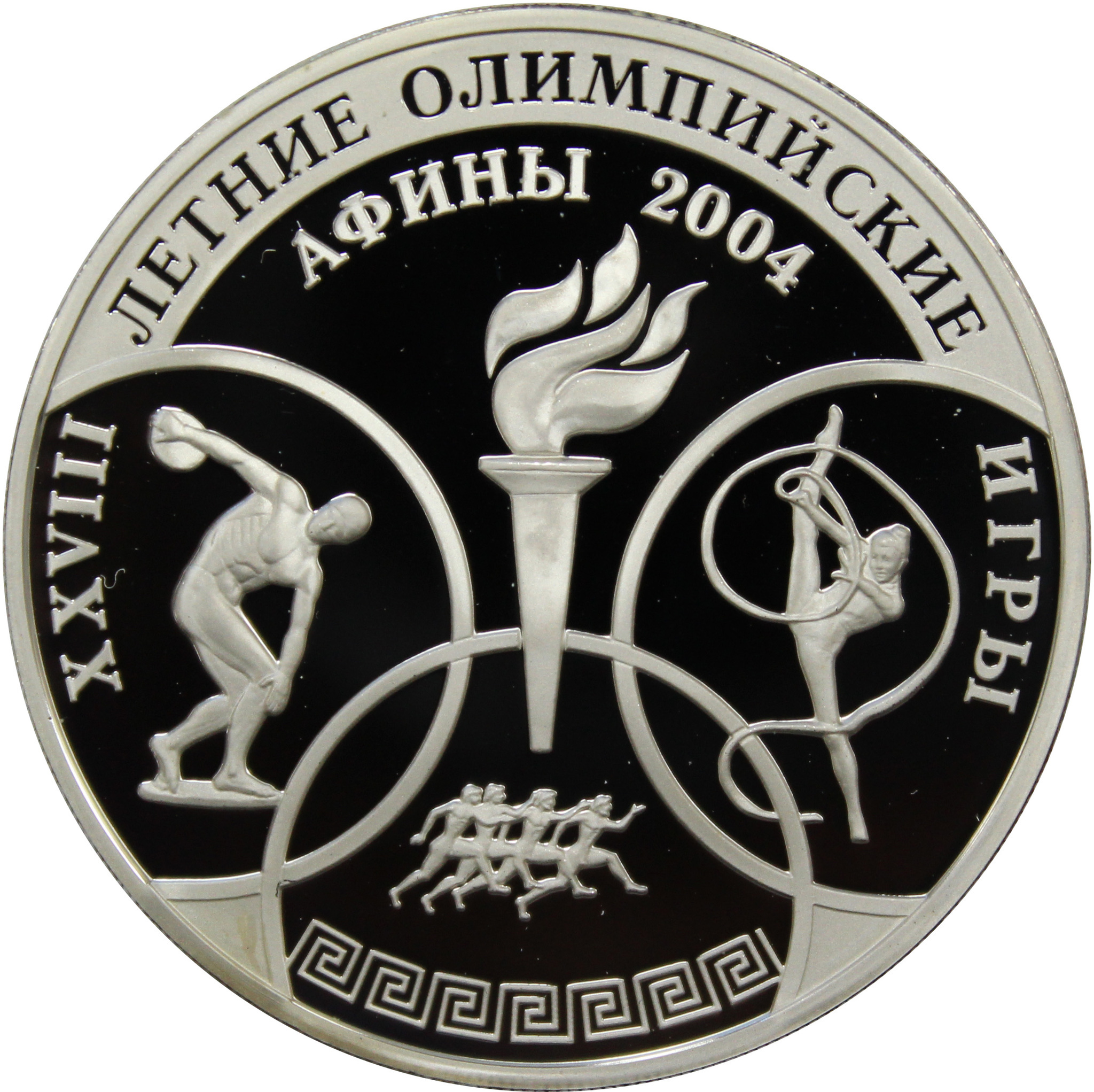 Реверс: В центре – олимпийский факел, над ним – надпись: «АФИНЫ 2004»,в переплетeнных кольцах слева – статуя «Дискобол», справа – гимнастка с лентой, внизу – стилизованное изображение античных бегунов, под ними – греческий орнамент, вверху по окружности – надпись: «XXVIII ЛЕТНИЕ ОЛИМПИЙСКИЕ ИГРЫ».