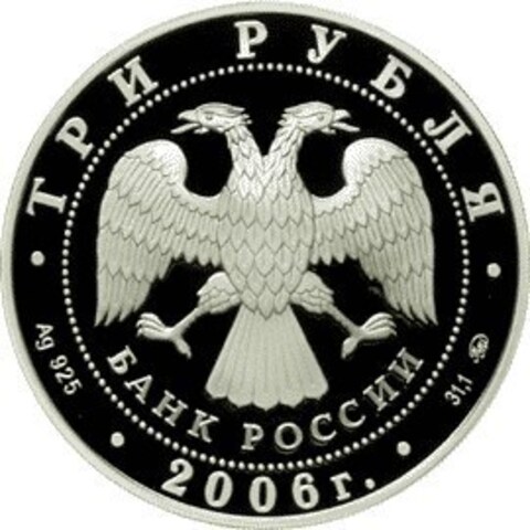 Аверс: вверху вдоль канта номинал «ТРИ РУБЛЯ», внизу слева химическое название «Ag» и проба «925» металла, внизу по центру год выпуска «2006 г.», внизу справа чистый вес находящегося в монете драгоценного металла «31,10» и монограмма монетного двора «ММД». В середине в ободке из точек двуглавый орел под ним с внутренней стороны точечного ободка слова «БАНК РОССИИ».