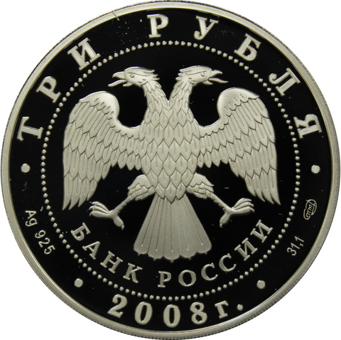 Аверс: Вверху вдоль канта номинал «ТРИ РУБЛЯ», внизу слева химическое название «Ag» и проба «925» металла, внизу по центру год выпуска «2008 г.», внизу справа чистый вес находящегося в монете драгоценного металла «31,10» и монограмма монетного двора «СПМД». В середине в ободке из точек двуглавый орел под ним с внутренней стороны точечного ободка слова «БАНК РОССИИ».