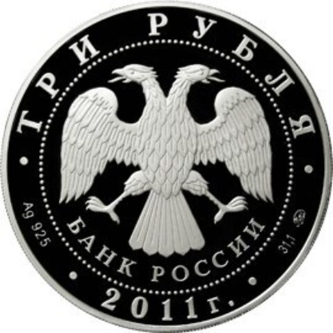 Аверс: вверху вдоль канта номинал «ТРИ РУБЛЯ», внизу слева химическое название «Ag» и проба «925» металла, внизу по центру год выпуска «2011 г.», внизу справа чистый вес находящегося в монете драгоценного металла «31,10» и монограмма монетного двора «ММД». В середине в ободке из точек двуглавый орел под ним с внутренней стороны точечного ободка слова «БАНК РОССИИ».