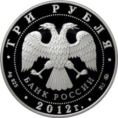 Аверс: вверху вдоль канта номинал «ТРИ РУБЛЯ», внизу слева химическое название «Ag» и проба «925» металла, внизу по центру год выпуска «2012 г.», внизу справа чистый вес находящегося в монете драгоценного металла «31,10» и монограмма монетного двора «ММД». В середине в ободке из точек двуглавый орел под ним с внутренней стороны точечного ободка слова «БАНК РОССИИ».