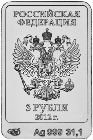 Аверс: в середине прямоугольника со скругленными углами орел со скипетром и державой с Государственного герба Российской Федерации, над ним слова «РОССИЙСКАЯ ФЕДЕРАЦИЯ», под орлом обозначение достоинства монеты «3 рубля» и год чеканки «2012 г.». Внизу под прямоугольником у края монеты монограмма монетного двора «ММД», химическое название «Ag» и проба «999» металла, чистый вес находящегося в монете драгоценного металла «31,10»