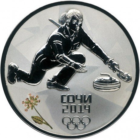 Реверс: В центре керлингистка, слева под ним в две строки надпись «СОЧИ» и дата «2014», под ними – пять олимпийских колец, левее выполненный в цвете примула весенняя.