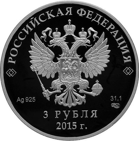 Аверс: В центре – Государственный герб Российской Федерации, над ним вдоль канта надпись: "РОССИЙСКАЯ ФЕДЕРАЦИЯ", внизу под гербом: слева – обозначения драгоценного металла и пробы сплава, справа – содержание химически чистого металла и товарный знак монетного двора, внизу в две строки – номинал: "3 РУБЛЯ" и год выпуска "2015 г.".