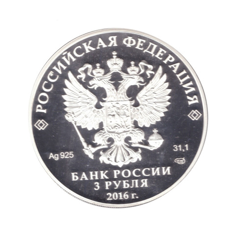 Аверс: На зеркальном поле диска – рельефное изображение Государственного герба Российской Федерации, над ним вдоль канта – надпись полукругом: "РОССИЙСКАЯ ФЕДЕРАЦИЯ", обрамленная с обеих сторон сдвоенными ромбами, внизу под гербом: слева – обозначения драгоценного металла и пробы сплава, справа – содержание химически чистого металла и товарный знак Санкт-Петербургского монетного двора, внизу в центре в три строки – надпись: "БАНК РОССИИ", номинал монеты: "3 РУБЛЯ", год выпуска: "2016 г.".