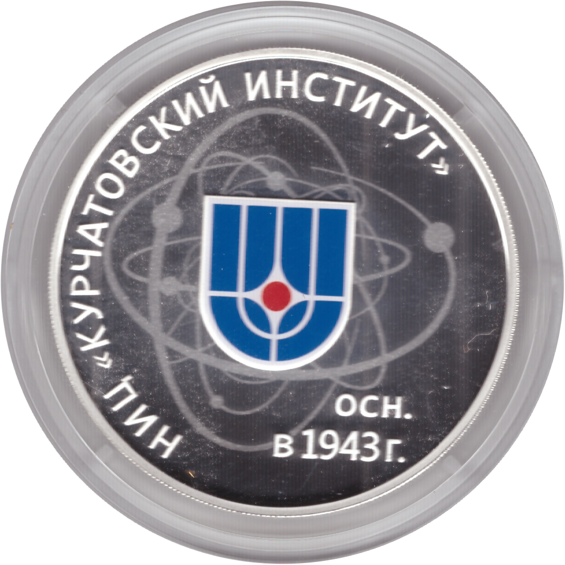 Реверс: Выполненное в цвете изображение эмблемы НИЦ «Курчатовский институт» на фоне стилизованной модели атома; имеются надписи: по окружности — «НИЦ «КУРЧАТОВСКИЙ ИНСТИТУТ», внизу в две строки — «осн. в 1943 г.».