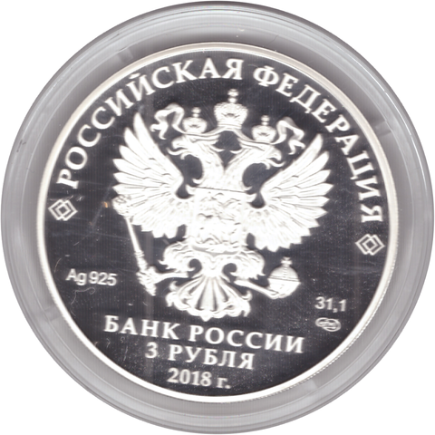 Аверс: Рельефное изображение Государственного герба Российской Федерации, над ним вдоль канта – надпись полукругом: "РОССИЙСКАЯ ФЕДЕРАЦИЯ", обрамленная с обеих сторон сдвоенными ромбами, внизу под гербом: слева – обозначения драгоценного металла и пробы сплава, справа – содержание химически чистого металла и товарный знак Санкт-Петербургского монетного двора, внизу в центре в три строки – надпись: "БАНК РОССИИ", номинал монеты: "3 РУБЛЯ", год выпуска: "2018 г.".