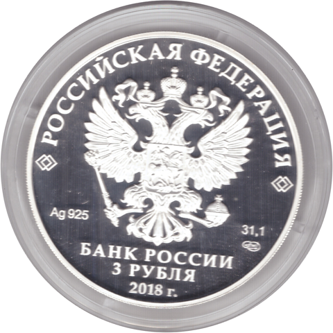 Аверс: Рельефное изображение Государственного герба Российской Федерации, над ним вдоль канта – надпись полукругом: "РОССИЙСКАЯ ФЕДЕРАЦИЯ", обрамленная с обеих сторон сдвоенными ромбами, внизу под гербом: слева – обозначения драгоценного металла и пробы сплава, справа – содержание химически чистого металла и товарный знак Санкт-Петербургского монетного двора, внизу в центре в три строки – надпись: "БАНК РОССИИ", номинал монеты: "3 РУБЛЯ", год выпуска: "2018 г.".