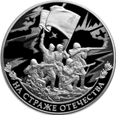 Реверс: рельефные изображения солдат, держащих в руке флаг, на фоне боевых действий, внизу по окружности имеется надпись «НА СТРАЖЕ ОТЕЧЕСТВА»