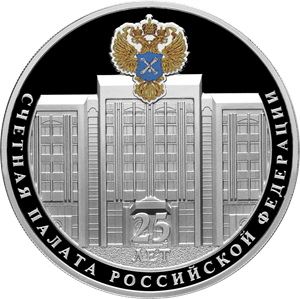 На монете расположено рельефное изображение здания Счетной палаты в Москве; вверху — выполненное в цвете изображение геральдического знака — эмблемы Счетной палаты Российской Федерации; имеются надписи, внизу в две строки: «25 ЛЕТ», по окружности: «СЧЕТНАЯ ПАЛАТА РОССИЙСКОЙ ФЕДЕРАЦИИ».