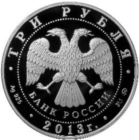 Аверс: вверху вдоль канта номинал «ТРИ РУБЛЯ», внизу слева химическое название «Ag» и проба «925» металла, внизу по центру год выпуска «2005 г.», внизу справа чистый вес находящегося в монете драгоценного металла «31,10» и монограмма монетного двора «ММД». В середине в ободке из точек двуглавый орел под ним с внутренней стороны точечного ободка слова «БАНК РОССИИ».