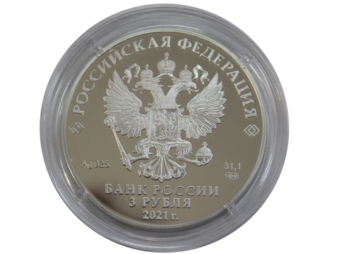На лицевой стороне монеты расположено рельефное изображение Государственного герба Российской Федерации, имеются надписи: «РОССИЙСКАЯ ФЕДЕРАЦИЯ», «БАНК РОССИИ», номинал монеты: «3 РУБЛЯ», дата: «2021 г.», обозначение металла по Периодической системе элементов Д.И. Менделеева, проба сплава, товарный знак Санкт-Петербургского монетного двора и масса драгоценного металла в чистоте.