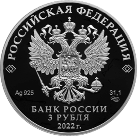 На лицевой стороне монет расположено рельефное изображение Государственного герба Российской Федерации, имеются надписи: «РОССИЙСКАЯ ФЕДЕРАЦИЯ», «БАНК РОССИИ», номинал монет: «3 РУБЛЯ», дата: «2022 г.», обозначение металла по Периодической системе элементов Д.И. Менделеева, проба сплава (проба), товарный знак Санкт-Петербургского монетного двора и масса драгоценного металла в чистоте.