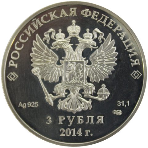 Аверс: Сверху вдоль края монеты слова «РОССИЙСКАЯ ФЕДЕРАЦИЯ» под ними орел со скипетром и державой с Государственного герба Российской Федерации, слева от орла химическое название «Ag» и проба «925» металла, справа от орла чистый вес находящегося в монете драгоценного металла «31,1» и под ним монограмма монетного двора «СПМД», ниже обозначение достоинства монеты «3 рубля» и под ним год проведения XXII Олимпийских зимних игр в г. Сочи «2014 г.».