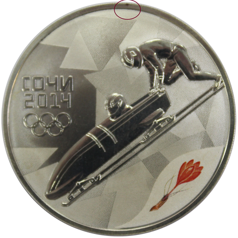 Реверс: В центре два бобслеиста (один в бобе, другой его толкает), слева под ним в две строки надпись «СОЧИ» и дата «2014», под ними – пять олимпийских колец, правее выполненный в цвете шафран Шарояна.