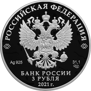 На лицевой стороне монеты расположено рельефное изображение Государственного герба Российской Федерации, имеются надписи: «РОССИЙСКАЯ ФЕДЕРАЦИЯ», «БАНК РОССИИ», номинал монеты: «3 РУБЛЯ», дата: «2021 г.», обозначение металла по Периодической системе элементов Д.И. Менделеева, проба сплава, товарный знак Санкт-Петербургского монетного двора и масса драгоценного металла в чистоте.