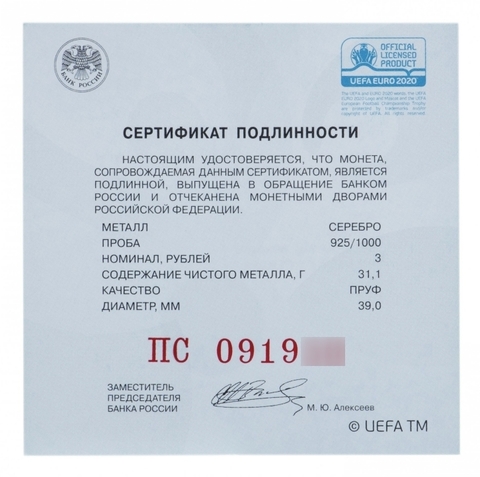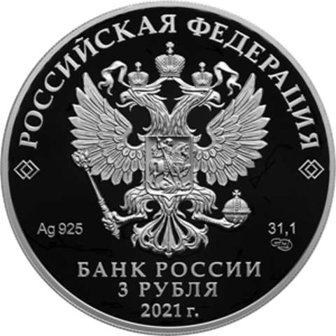 На лицевой стороне монет расположено рельефное изображение Государственного герба Российской Федерации, имеются надписи: «РОССИЙСКАЯ ФЕДЕРАЦИЯ», «БАНК РОССИИ», номинал монеты «3 РУБЛЯ» дата: «2021 г.», обозначение металла по Периодической системе элементов Д.И. Менделеева, проба сплава (проба), товарный знак Санкт-Петербургского монетного двора и масса драгоценного металла в чистоте.
