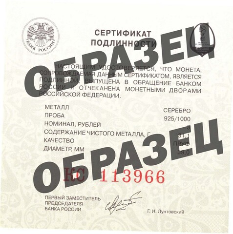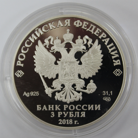 монеты расположено рельефное изображение Государственного герба Российской Федерации, имеются надписи: «РОССИЙСКАЯ ФЕДЕРАЦИЯ», «БАНК РОССИИ», номинал монет − «3 РУБЛЯ» и дата − «2018 г.», обозначение металла по Периодической системе элементов Д И. Менделеева, проба сплава, товарный знак Санкт-Петербургского монетного двора и масса драгоценного металла в чистоте.