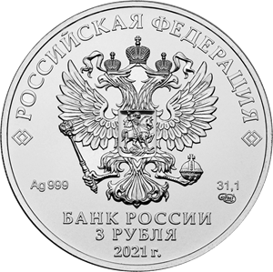 Аверс: Вверху вдоль канта номинал «ТРИ РУБЛЯ», внизу слева химическое название «Ag» и проба «999» металла, внизу по центру год выпуска «2021 г.», внизу справа чистый вес находящегося в монете драгоценного металла «31,10» и монограмма монетного двора «ММД». В середине в ободке из точек двуглавый орел под ним с внутренней стороны точечного ободка слова «БАНК РОССИИ».