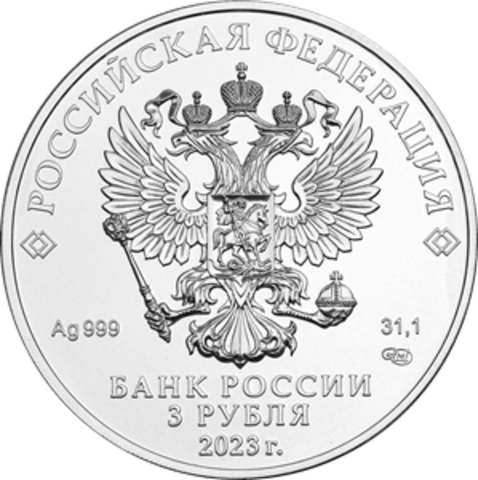Аверс: Вверху вдоль канта номинал «ТРИ РУБЛЯ», внизу слева химическое название «Ag» и проба «999» металла, внизу по центру год выпуска «2023 г.», внизу справа чистый вес находящегося в монете драгоценного металла «31,10» и монограмма монетного двора «ММД». В середине в ободке из точек двуглавый орел под ним с внутренней стороны точечного ободка слова «БАНК РОССИИ».