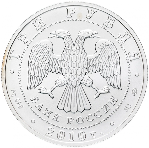 Аверс: в центре - эмблема Банка России (двуглавый орёл с опущенными крыльями, под ним - надпись полукругом "БАНК РОССИИ"), обрамленная кругом из точек и надписями по кругу - вверху: "ТРИ РУБЛЯ", внизу: слева - обозначения драгоценного металла и пробы сплава, в центре - дата выпуска, справа - содержание химически чистого металла и товарный знак монетного двора.