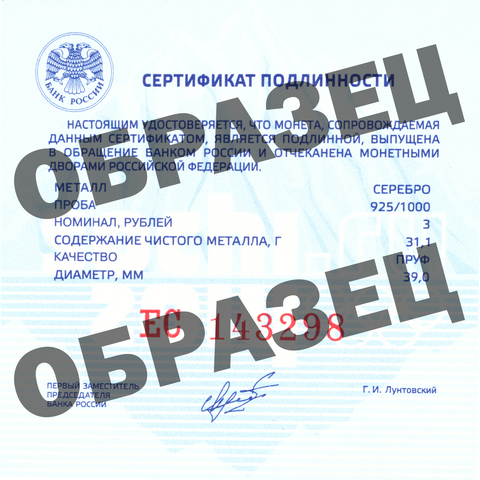 Аверс: в центре – эмблема Банка России (двуглавый орёл с опущенными крыльями, под ним – надпись полукругом "БАНК РОССИИ"), обрамленная кругом из точек и надписями по кругу – вверху: "ТРИ РУБЛЯ", внизу: слева – обозначения драгоценного металла и пробы сплава, в центре – год выпуска "2015 г.", справа – содержание химически чистого металла и товарный знак монетного двора.