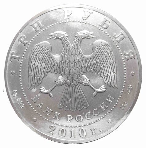 Аверс: Расположено рельефное изображение Государственного герба Российской Федерации, имеются надписи: «РОССИЙСКАЯ ФЕДЕРАЦИЯ», «БАНК РОССИИ», номинал монет — «3 РУБЛЯ» и дата — «2010 г.», обозначение металла по Периодической системе элементов Д. И. Менделеева, проба сплава, товарный знак Санкт-Петербургского монетного двора и масса драгоценного металла в чистоте.