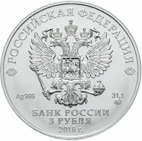 Аверс: Вверху вдоль канта номинал «ТРИ РУБЛЯ», внизу слева химическое название «Ag» и проба «999» металла, внизу по центру год выпуска «2018 г.», внизу справа чистый вес находящегося в монете драгоценного металла «31,10» и монограмма монетного двора «ММД». В середине в ободке из точек двуглавый орел под ним с внутренней стороны точечного ободка слова «БАНК РОССИИ».