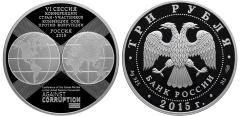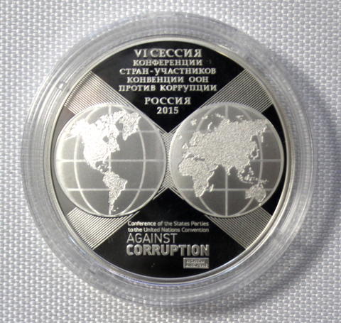 Реверс: на зеркальном поле диска в центре, на пересечении двух полос, образованных тонкими линиями – изображение двух полушарий Земли с контурами континентов, вверху – надпись в семь строк: "VI СЕССИЯ КОНФЕРЕНЦИИ СТРАН-УЧАСТНИКОВ КОНВЕНЦИИ ООН ПРОТИВ КОРРУПЦИИ РОССИЯ 2015", внизу – надпись в четыре строки: "CONFERENCE OF THE STATES PARTIES TO THE UNITED NATIONS CONVENTION AGAINST CORRUPTION", под ней справа на светлом четырехугольнике: "VI Session Russia 2015".