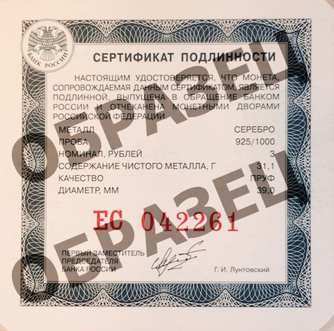 Аверс: вверху вдоль канта номинал «ТРИ РУБЛЯ», внизу слева химическое название «Ag» и проба «925» металла, внизу по центру год выпуска «2011 г.», внизу справа чистый вес находящегося в монете драгоценного металла «31,10» и монограмма монетного двора «СПМД». В середине в ободке из точек двуглавый орел под ним с внутренней стороны точечного ободка слова «БАНК РОССИИ».