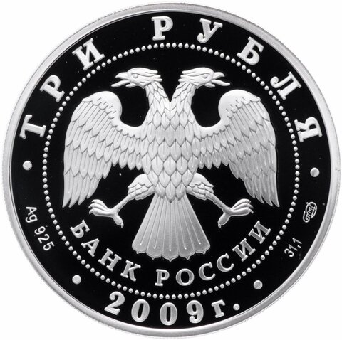 Аверс: вверху вдоль канта номинал «ТРИ РУБЛЯ», внизу слева химическое название «Биметалл» и проба «925» металла, внизу по центру год выпуска «2009 г.», внизу справа чистый вес находящегося в монете драгоценного металла «1,55/31,10» (золото/серебро) и монограмма монетного двора «СПМД». В середине в ободке из точек двуглавый орел под ним с внутренней стороны точечного ободка слова «БАНК РОССИИ».