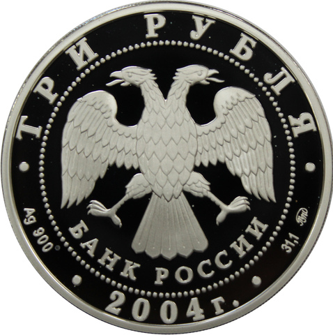 Аверс: вверху вдоль канта номинал «ТРИ РУБЛЯ», внизу слева химическое название «Ag» и проба «900» металла, внизу по центру год выпуска «2004 г.», внизу справа чистый вес находящегося в монете драгоценного металла «31,10» и монограмма монетного двора «СПМД». В середине в ободке из точек двуглавый орел под ним с внутренней стороны точечного ободка слова «БАНК РОССИИ».