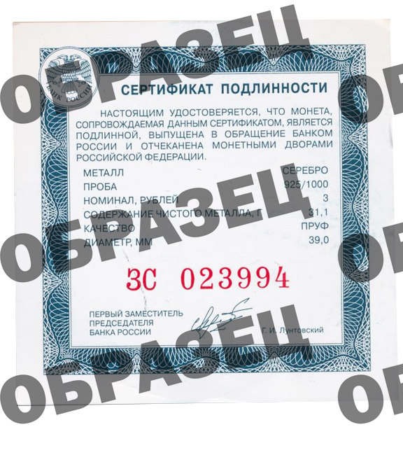 На лицевой стороне монеты расположено рельефное изображение Государственного герба Российской Федерации, имеются надписи: «РОССИЙСКАЯ ФЕДЕРАЦИЯ», «БАНК РОССИИ», номинал монеты: «3 РУБЛЯ», дата: «2021 г.», обозначение металла по Периодической системе элементов Д.И. Менделеева, проба сплава, товарный знак Санкт-Петербургского монетного двора и масса драгоценного металла в чистоте.