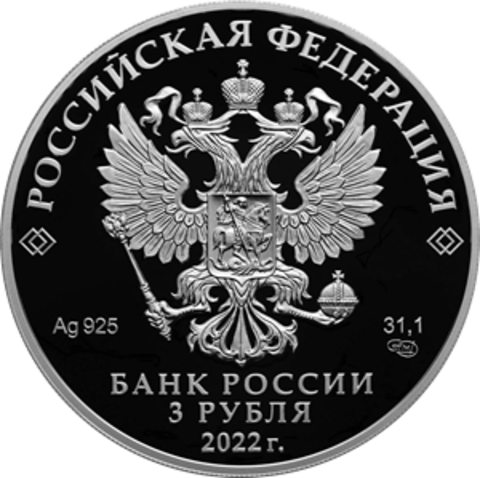 На лицевой стороне монеты расположено рельефное изображение Государственного герба Российской Федерации, имеются надписи: «РОССИЙСКАЯ ФЕДЕРАЦИЯ», «БАНК РОССИИ», номинал монеты: «3 РУБЛЯ», дата: «2022 г.», обозначение металла по Периодической системе элементов Д.И. Менделеева, проба сплава, товарный знак Санкт-Петербургского монетного двора и масса драгоценного металла в чистоте.