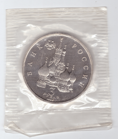 Аверс: сверху слева - небольшое изображение двухглавого орла, слева - слово «Банк», справа «России», внизу - обозначение достоинства монеты - цифра «3», под ним - слово «рубля», ниже - год выпуска монеты «1992», в середине - Собор Покрова Пресвятой Богородицы (собор Василия Блаженного) и за ним Спасская башня Московского Кремля, чуть ниже и правее - монограмма монетного двора «ЛМД».