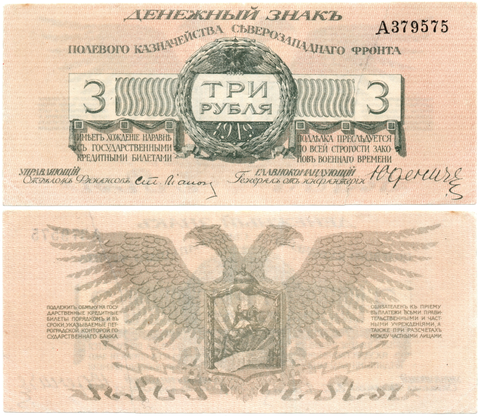 3 рубля Юденич 1919 год Полевое Казначейство Северо-Западного фронта РСФСР