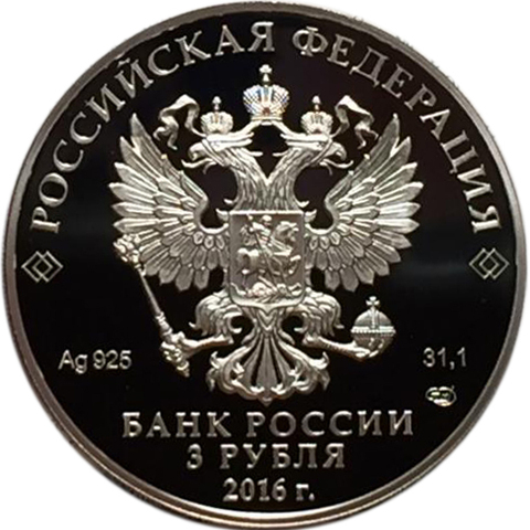 Аверс: верхнюю часть канта монеты полукругом занимает надпись: «Российская Федерация». С обеих сторон ее закрывают фигурки в виде двух пересекающихся ромбов. Снизу от канта выделены три горизонтальные строки: первая — с указанием эмитента изделия «Банк России»; вторая часть отображает номинал монеты (3 рубля), а третья — год чеканки тиража (2016). Центральную часть занимает рельефное изображение государственного герба. Слева от нее расположена отметка с химическим названием металла и пробой (925). Справа указана масса серебра и монограмма монетного двора Санкт-Петербурга.