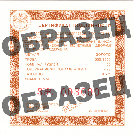 Аверс: На лицевой стороне монет расположено рельефное изображение Государственного герба Российской Федерации, имеются надписи: «РОССИЙСКАЯ ФЕДЕРАЦИЯ», «БАНК РОССИИ», номинал монет и дата, обозначение металла по Периодической системе элементов Д.И. Менделеева, проба сплава, товарный знак Московского монетного двора и масса драгоценного металла в чистоте.