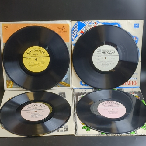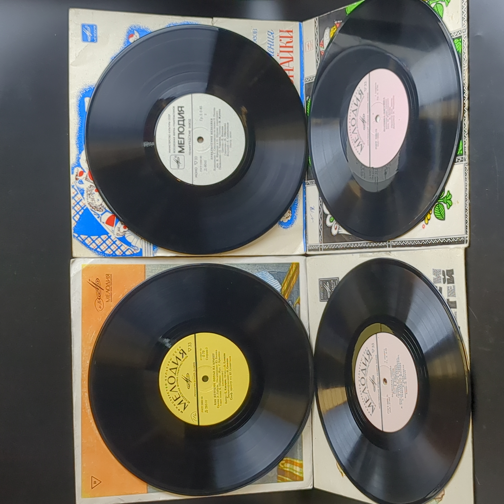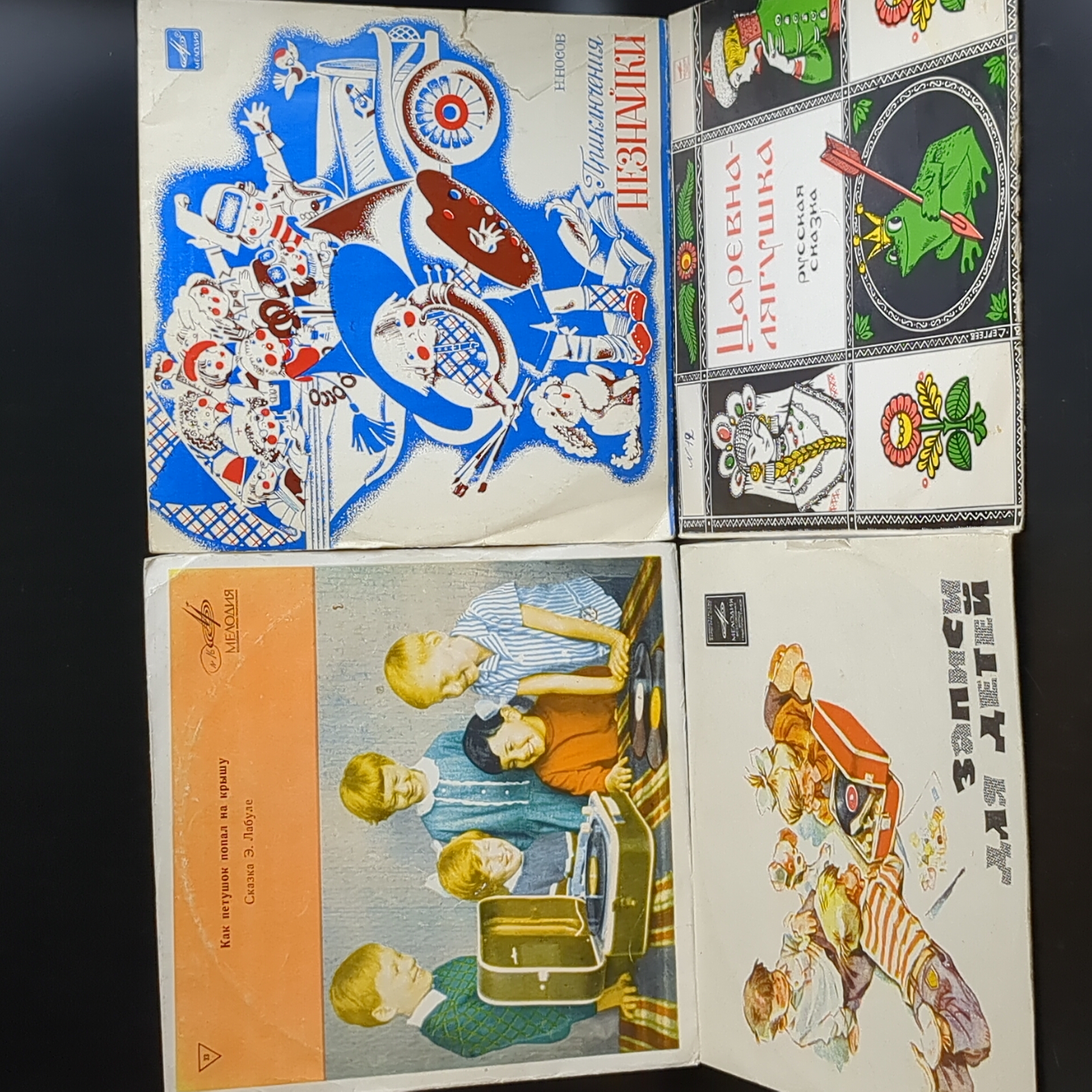 4 детские пластинки со сказками : Приключения незнайки / Как петушок попал на крышу / Царевна лягушка / Волшебная семерка. 4 Виниловые пластинки 10 дюймов. Мелодия СССР.